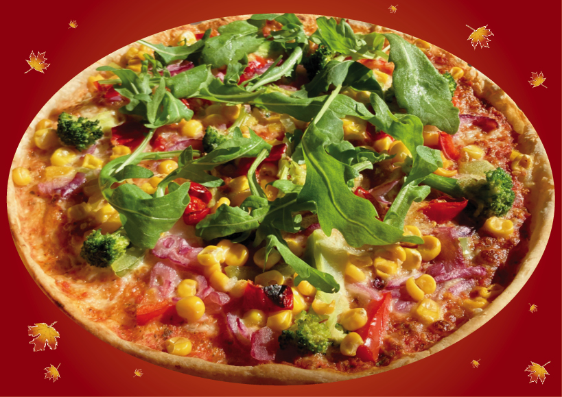 Herbstpizza 1: Brokkoli, Mais, Zwiebeln, Paprika und Rucola - Sonderpreis: 13,90 statt 17,40 € in Größe M=28cm