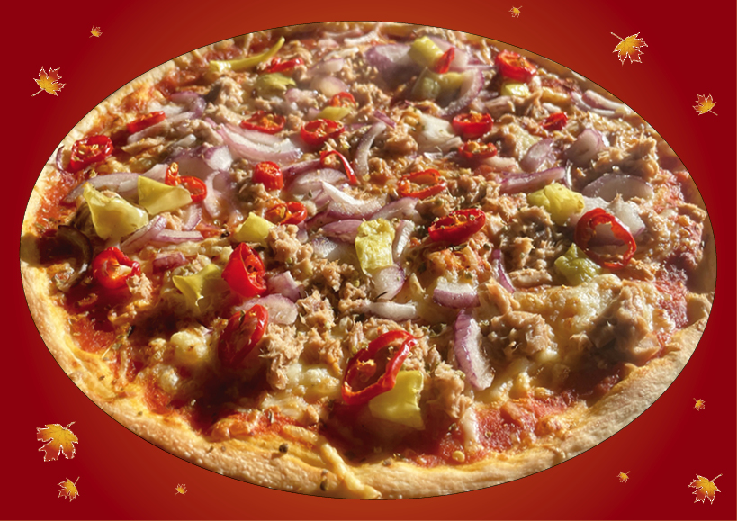 Herbstpizza 2: Thunfisch, Zwiebeln und pikanter Peperonimix - Sonderpreis: 12,90 statt 16,10 € in Größe M=28cm