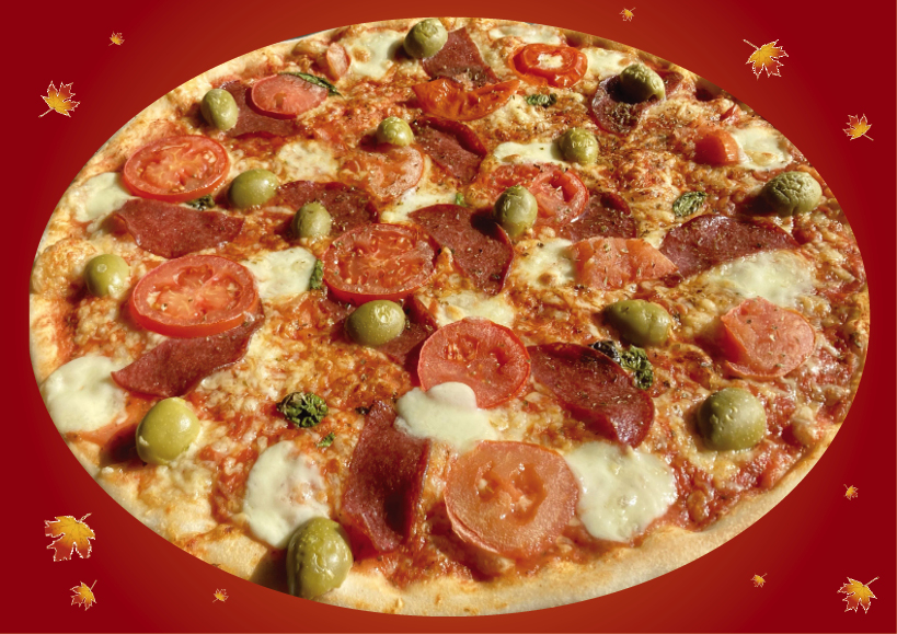 Herbstpizza 3: Salami, Tomaten, Mozzarella, Basilikum und Oliven - Sonderpreis: 15,50 statt 18,70 € in Größe M=28cm