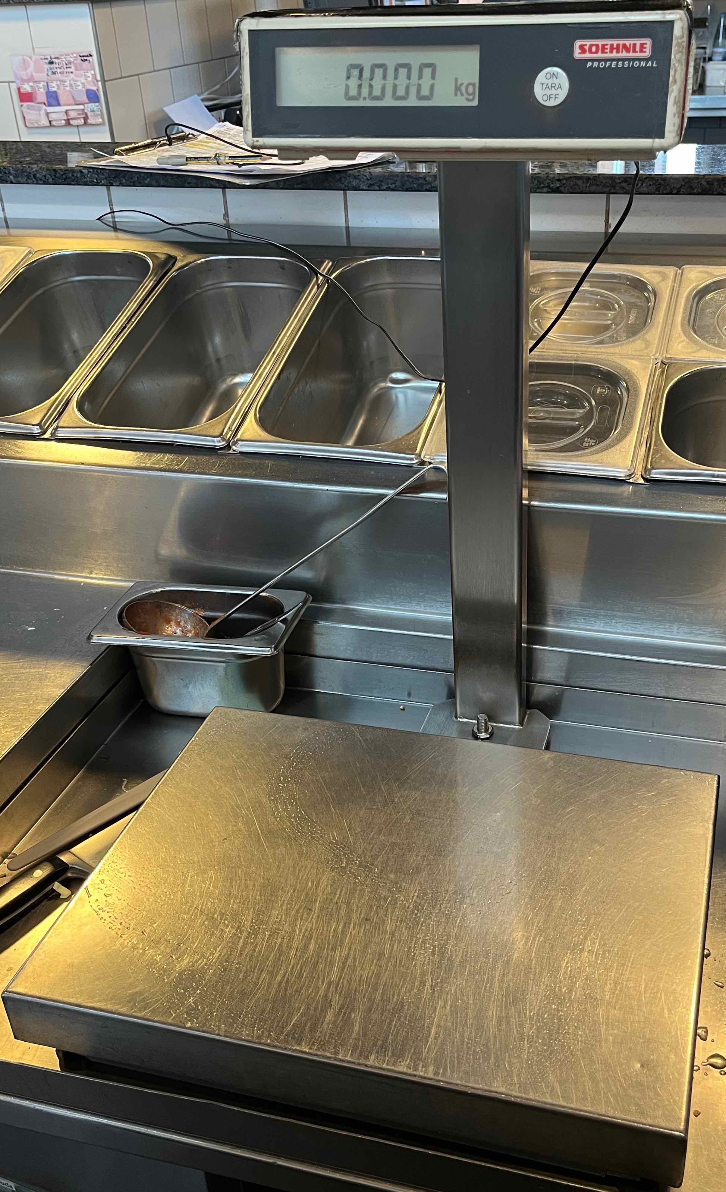 Die zwei Soehnle Profiwaagen haben sich beim permanenten Abwiegen der Pizzabeläge bewährt.Neben der Kostenkontrolle wird auch eine gleichbleibende Qualtität durch das Wiegen gesichert.