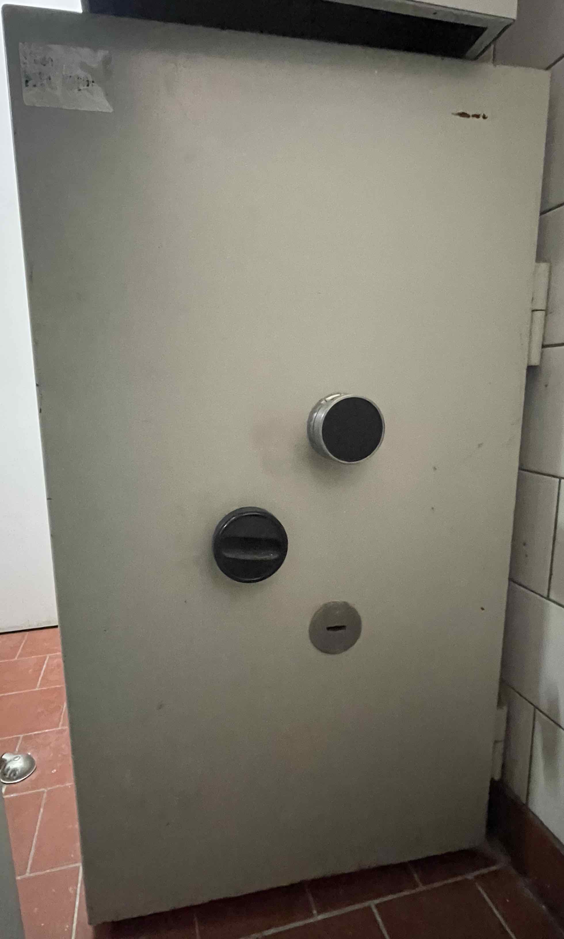 Diesen ehemaligen Banktresor mit seinen 380 KG Gewicht trägt niemand so schnell unerlaubt weg.Breite x Tiefe x Höhe: 575 x 830 x 1010 mm.