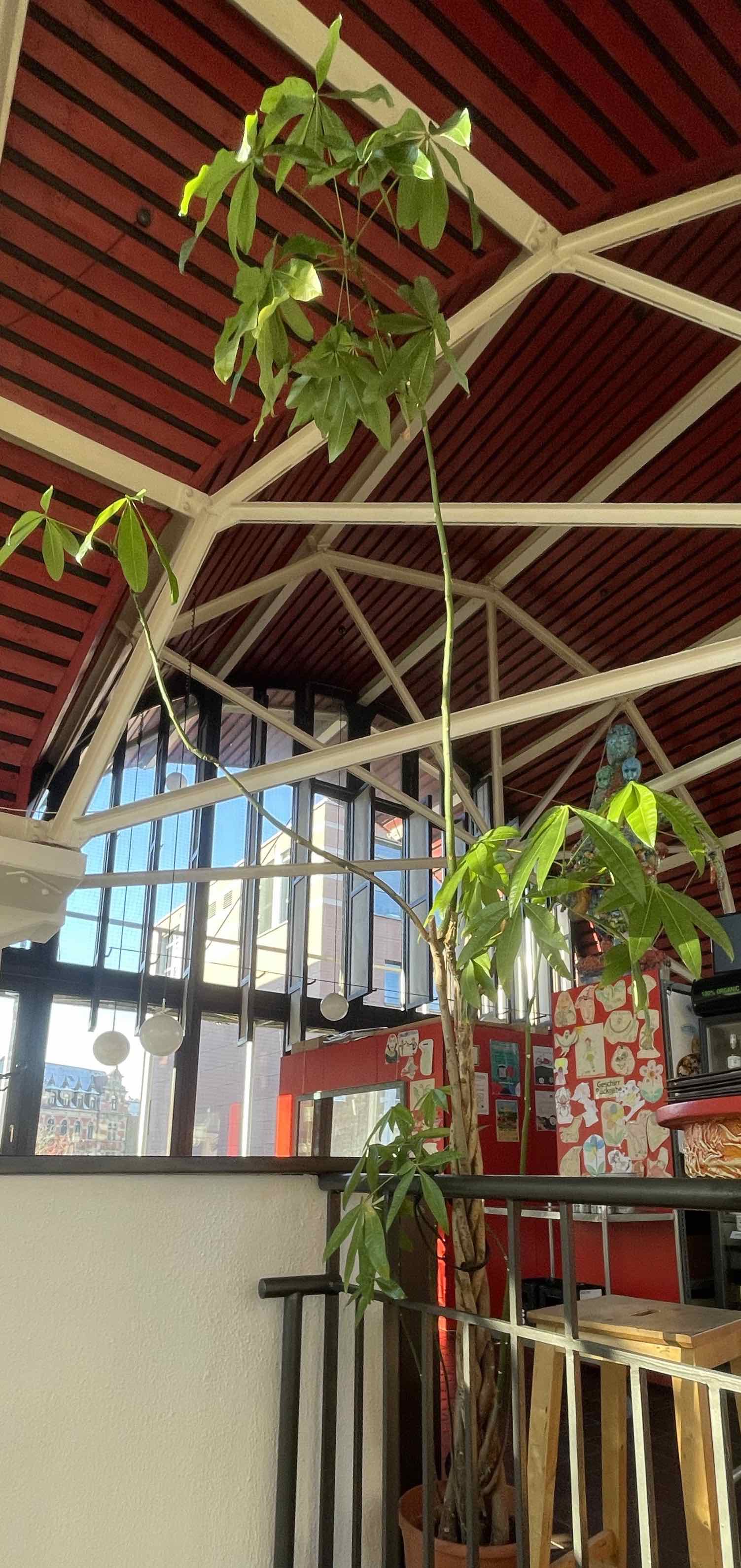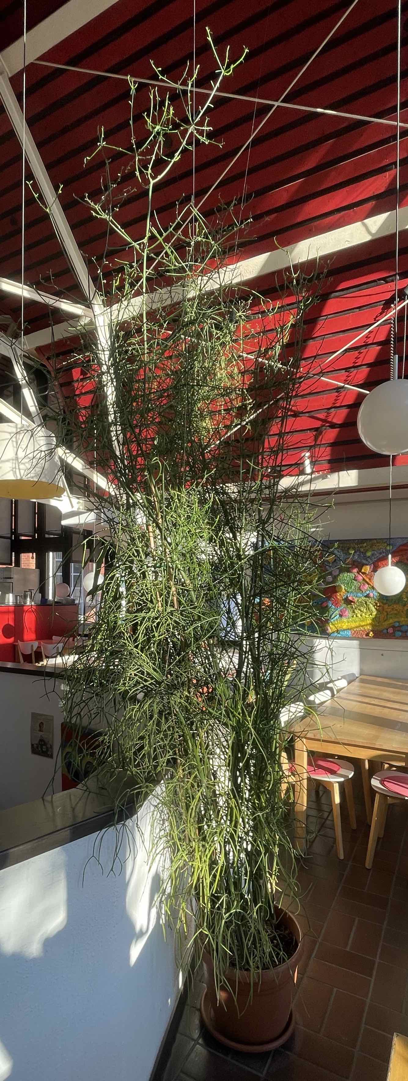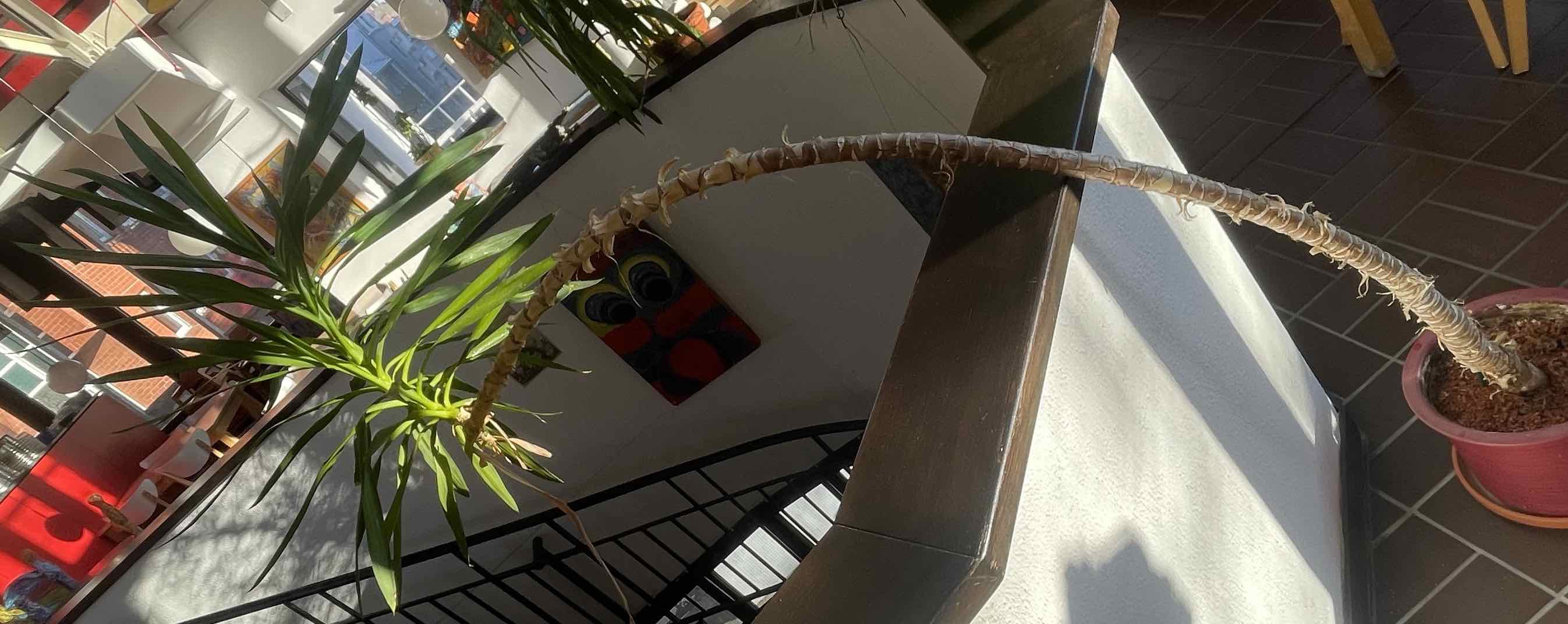 Höhe: langer, krummer Stamm ca. 200cm, dann im 90° Winkel abstehende 90 cm lange Blätter.