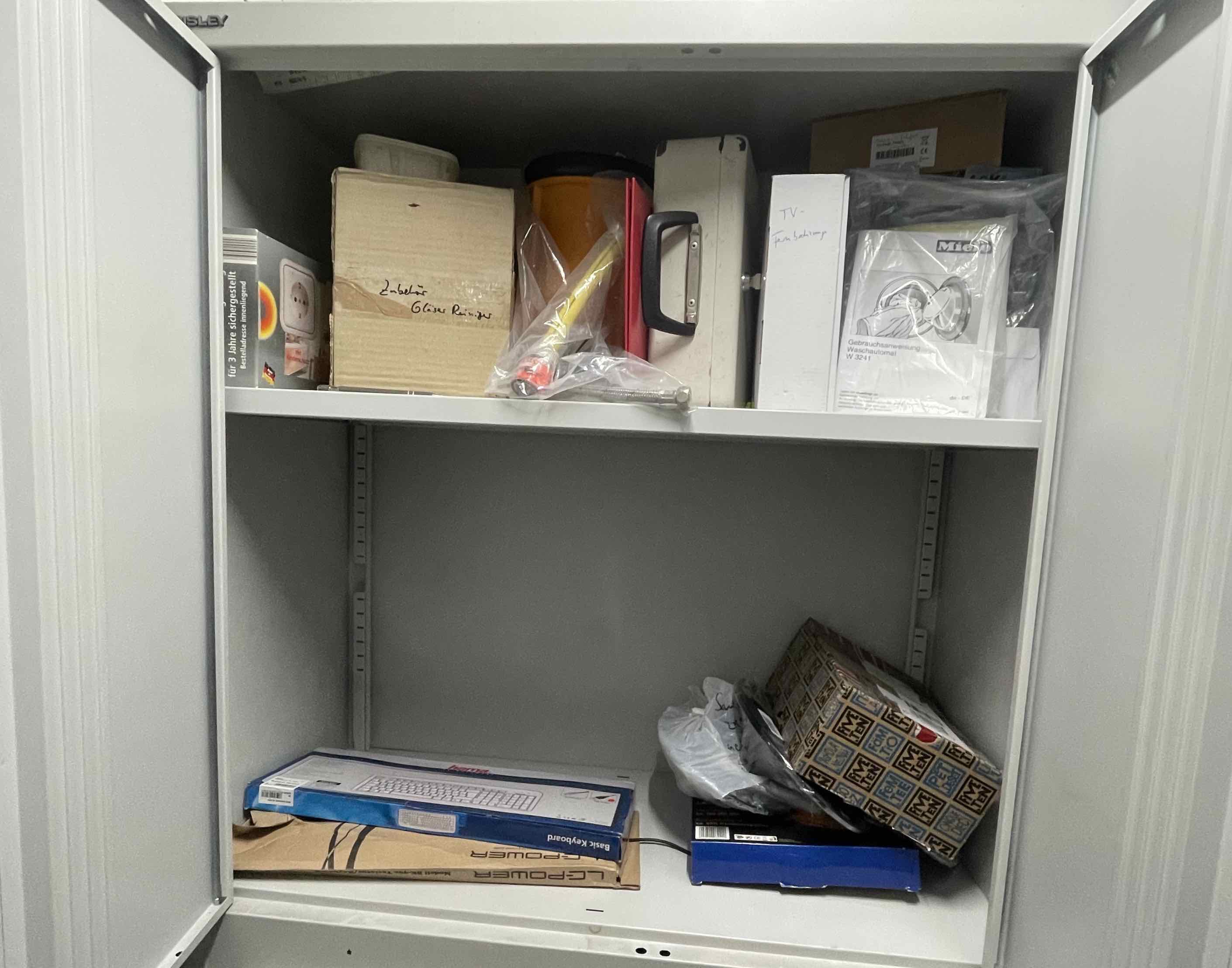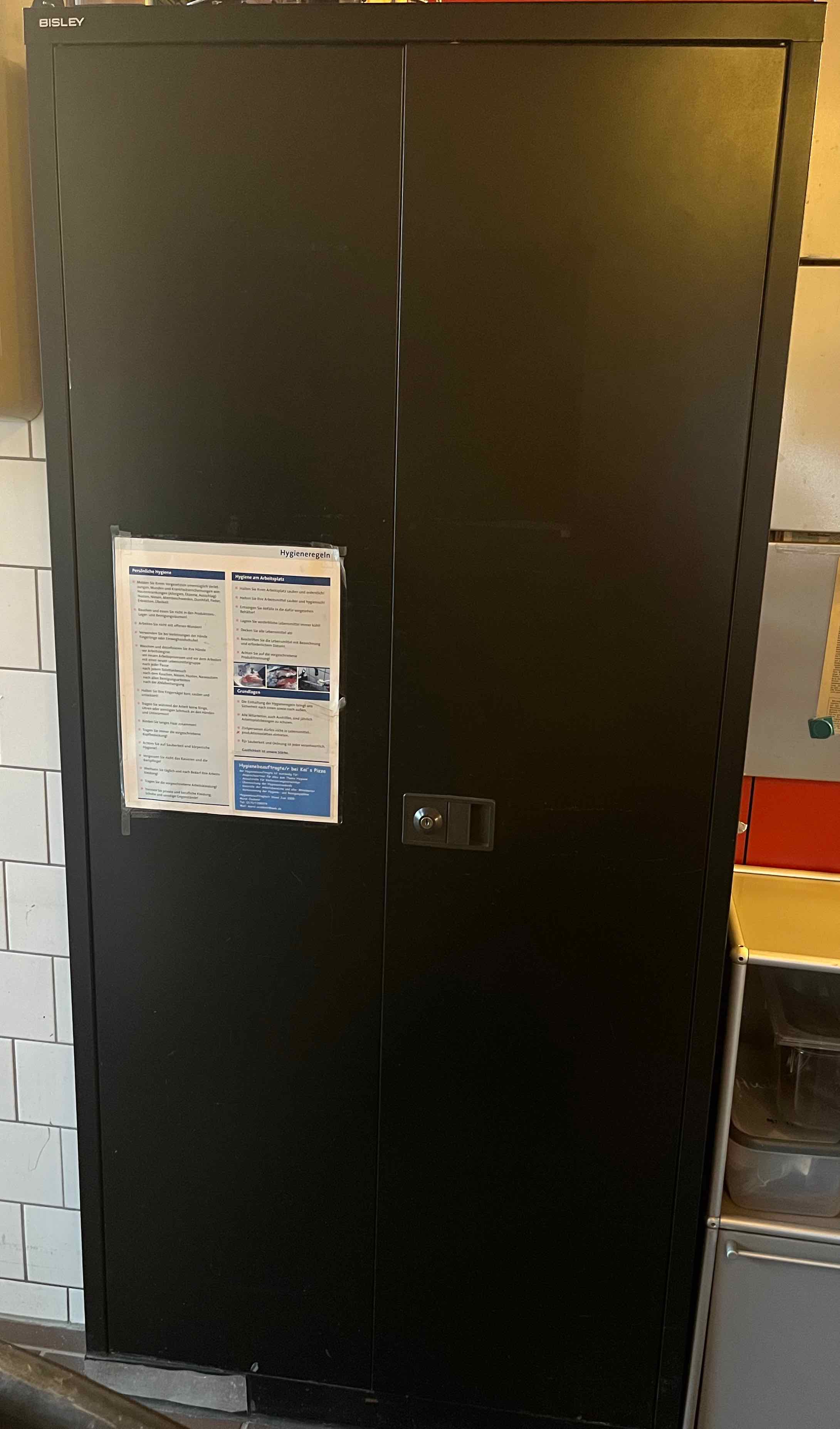 Einen grauen, abschließbaren Sisley Schrank, mit zwei Regalböden.