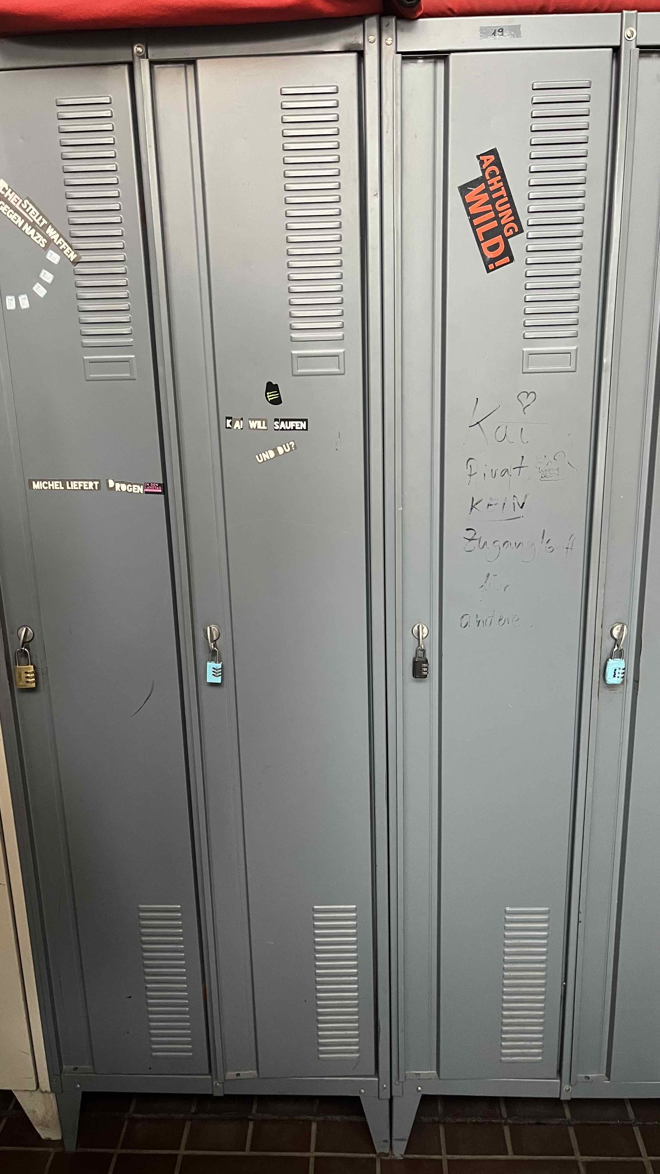 Jeder einzelne der 6 ca. 45 cm hohen Spinde hat oben eine Kleiderstange, aber keine Zwischenböden.Breite x Tiefe x Höhe: 900 x 500 x 1850 mm