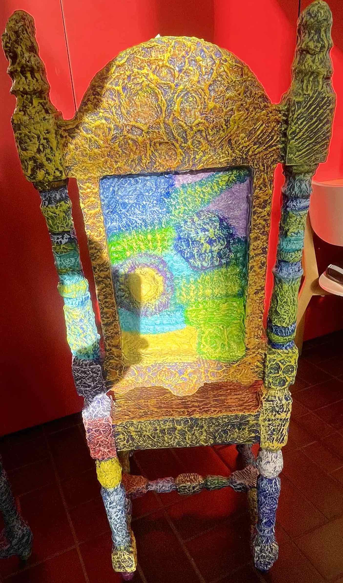Die vier thronesken Stühle sind farbenfroh, stabil gearbeitet und erstaunlich schwer.