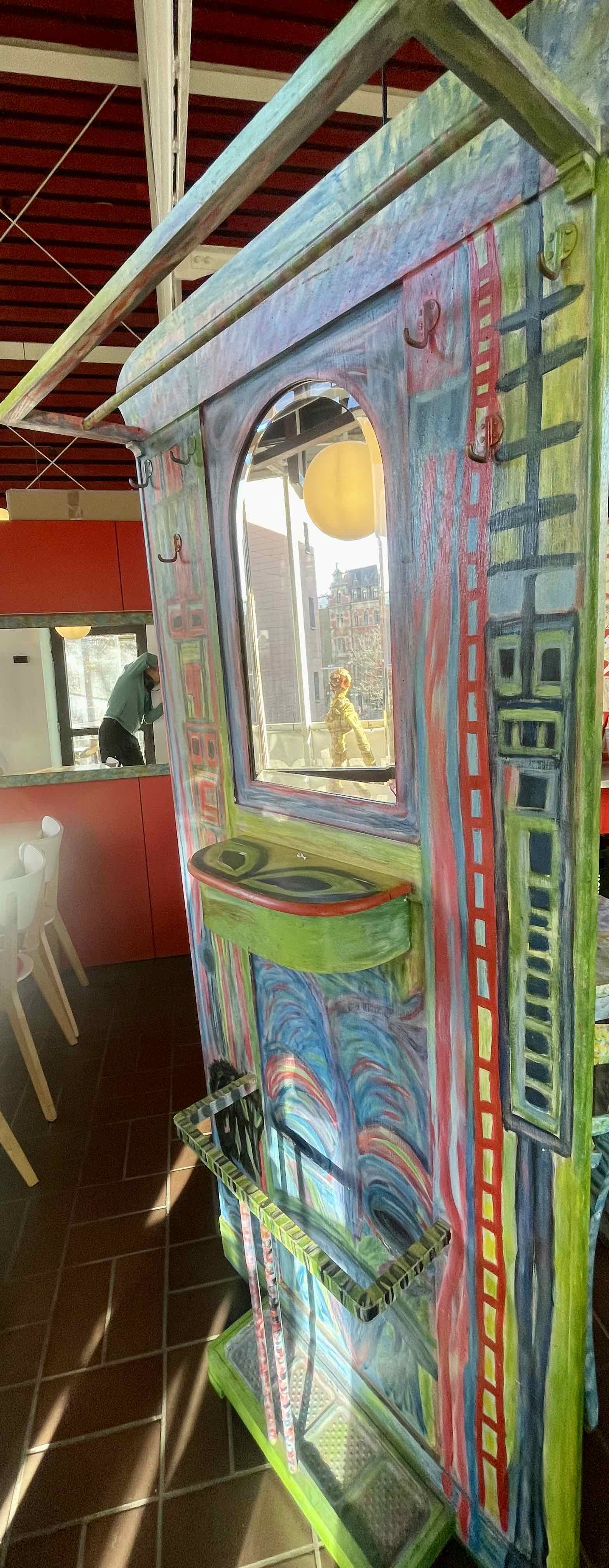 Sehr bunte, freistehende Garderobe, mit SpiegelMaße der Garderobe: Breite x Tiefe x Höhe: 950 x 35 x 2000 mm.